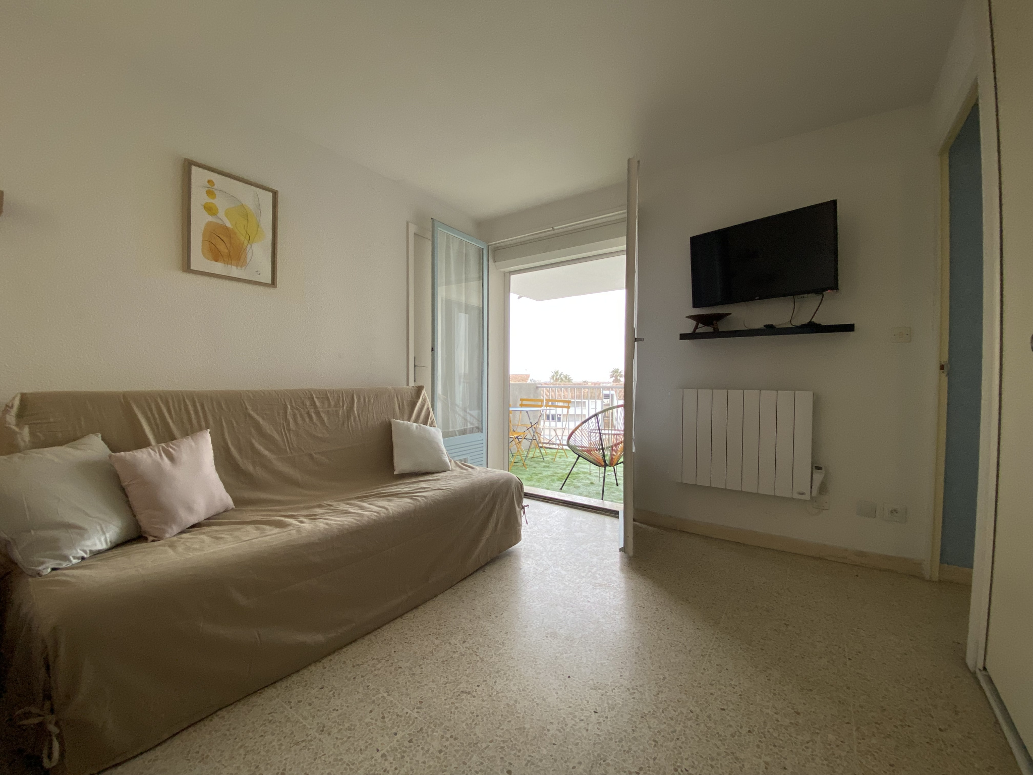 L'appartement se compose de deux chambres lumineuses, d'une salle d'eau entièrement rénovée et d'un vaste séjour donnant sur une magnifique terrasse. Cette dernière offre une vue dégagée sur les Salins et la cité médiévale d'Aigues-Mortes, un cadre idéal pour vos moments de détente en plein air.